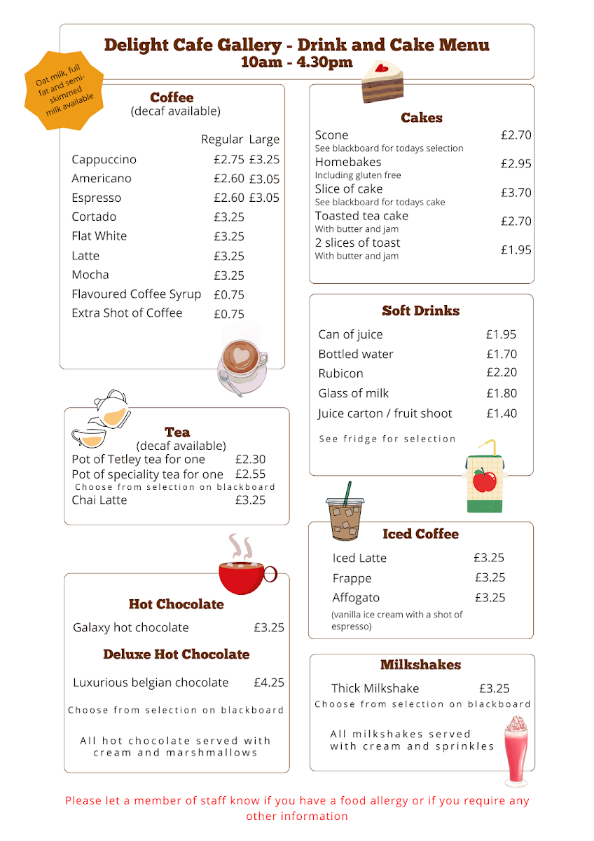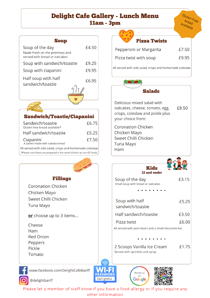 Welcome to the Delight Café Gallery, a charming haven located in the heart of Banff. This quaint café not only serves as a delightful dining spot but also showcases a unique gallery of arts, crafts, and locally made products. The menu is a celebration of comfort food featuring a range of homemade soups, delicious toasties, and ciabatta paninis that are sure to tantalize your taste buds.